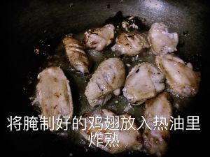 在锅里,加少量油,加热至四成;下冰糖,待融化,成焦糖色;下鸡翅,翻炒上色。