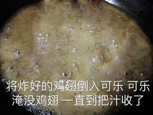 倒入,腌制鸡翅的汁水和姜片;加可乐,没过鸡翅;加热沸腾,收干大部分汁水,少量留着挂芡;加入水淀粉,挂芡。