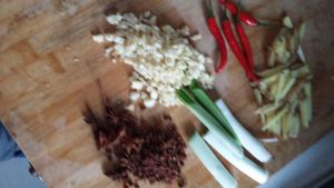 准备好各种调料,备用(忽略我那黑黑的切菜板哈)