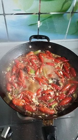 加入适量的水,和龙虾持平就行,我一不小心就加多了,后来怎么都收不干水了