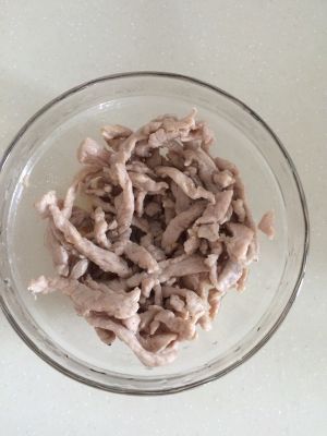肉丝切丝!用盐.料酒.生姜未.生抽.生粉.胡椒粉!腌制拌匀!