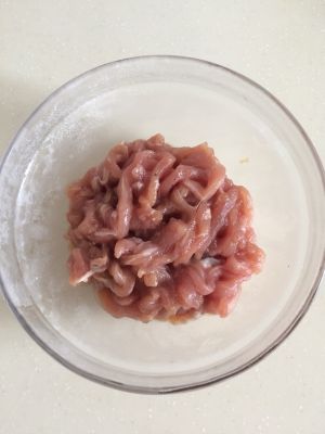 1. 准备食材,肉丝加盐、2汤匙生抽、1汤匙料酒和玉米淀粉顺时针方向搅拌均匀并腌制五分钟备用。