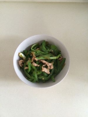 将青椒炒断生后加入炒好的瘦肉一起翻炒,炒熟后调味出锅。