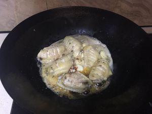 将切好的干辣椒,蒜,花椒一起放油锅炸。火不要太大!爆香后再放鸡翅一起,翻炒一下后加可乐。注意要漫过鸡翅哦!