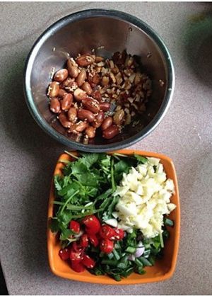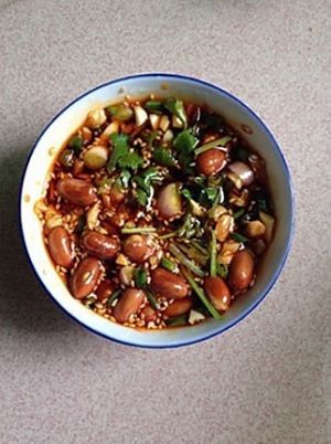 加入花生米,葱,香菜,蒜,芝麻调成汁料。