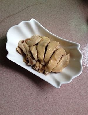 取出泡凉的鸡切块装盘。