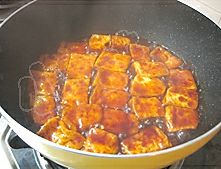 锅中多放点油.烧至七成熟时,转中火.倒入裹好淀粉的豆腐块.炸时大勺在锅中慢慢搅动,这样豆腐就不会粘在一起了.豆腐块炸成金黄色后捞出.沥去油分摆装入盘中.