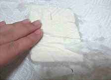 老豆腐切成麻将大小的块,用厨房纸仔细吸干表面的水份。