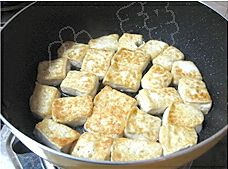 锅内油烧到八成热后,将豆腐块一个个放入,煎到两面金黄。