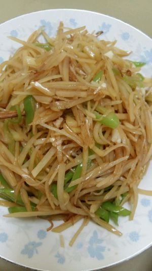 下去土豆丝煸炒,土豆丝变软后加入青椒丝(炒的过程中可以加入少量水,防止粘锅);加入生抽和盐调味;