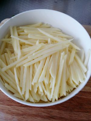 土豆切成丝,(原谅我的刀功,做了几年饭我也不敢快速切)用清水泡一会,这是我泡好了的,用水是为了去掉土豆上的淀粉,这样炒出来的土豆丝口感好,也不容易粘锅