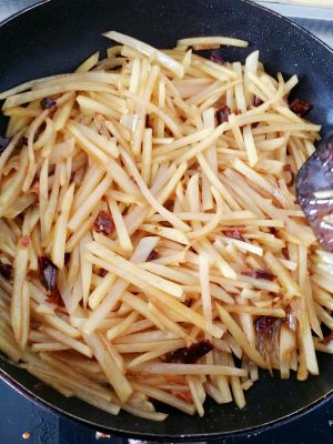 倒进土豆丝翻炒,加入酱油,盐,和醋,大火翻炒翻炒再翻炒,我用的平锅,这样不沾能炒的熟透