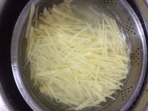 土豆切成大小相等的细丝,放入水中浸泡,以泡去淀粉。注意不要切得太粗。
