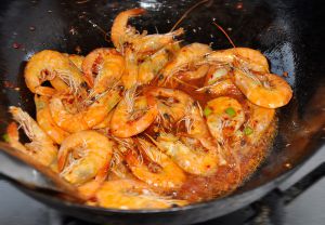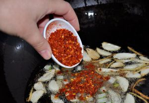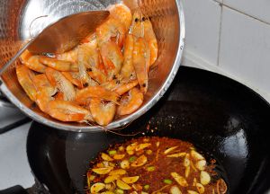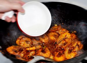 越5秒后放入泡好的烤虾翻炒,放适量料酒,继续翻炒