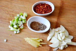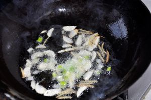 热锅凉油放入生姜丝,炒至微微变黄放入葱蒜,炒至蒜变成金黄色