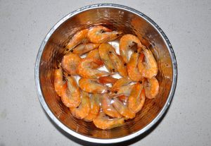 首先将每一个大虾都剪掉两根长须,用牙签在第三节处挑去虾线