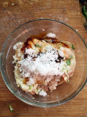 将肉馅放入糖,低钠盐,酱油,蚝油,五香粉,料酒,腌制十分钟,然后和剁好的梅菜混合均匀。