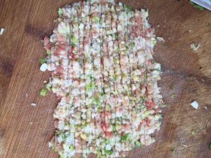 五花肉先切丝,再切丁,葱姜蒜和肉丁一起剁成泥备用