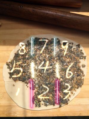 将面饼均匀的横切三分,将肉馅涂抹在饼上,留一个空白角,然后把1折到2上,再把3折到2上,变成了正方块,折好的方块放在4上,将5折在4上,包住正方块,以此类推,然后擀成薄饼。