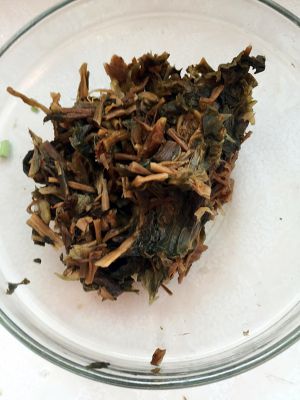 梅菜干用水洗五遍,直到没有沙子,不用水泡,泡过以后会没味道,直接洗就行了,洗净剁碎备用