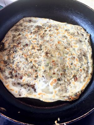锅中放油,开大火,放入饼后转中小火,两面煎至熟后,转大火,再次快速两面煎至金黄出锅,第一次开大火为了使饼定型,转小火是为了让中间完全变熟,最后转大火是为了表皮更酥脆。