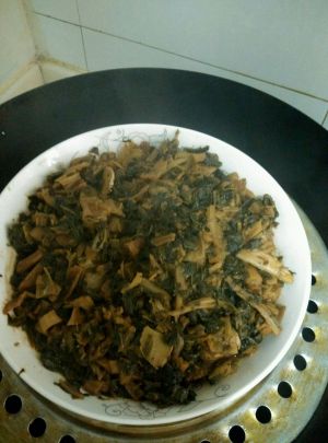 放入炒好的梅干菜,用勺子压实,上锅蒸30分钟,我用的高压锅,普通锅适当延长时间