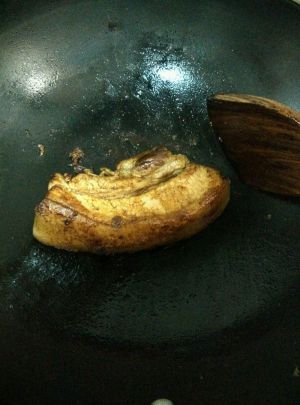 将煮好的肉放入锅中,倒入少许油煎至两面金黄,加入少许生抽上色