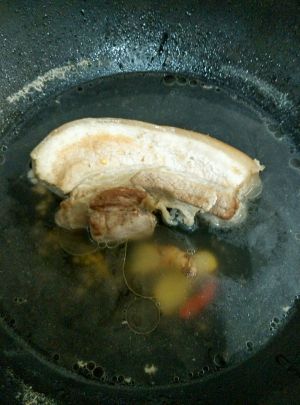 五花肉洗干净,锅里加8分满水,放入五花肉,加入料酒、2粒八角、大葱段、姜片、大火烧开转小火,盖上锅盖煮二十分钟左右。