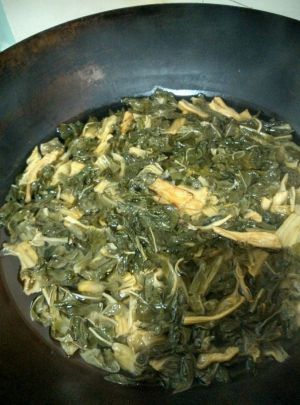 1.处理梅干菜,泡软洗净,切碎。 2.锅中加油,炒香蒜末,加入梅干菜炒出香味,加入腌肉料汁,炒香。