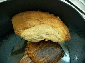 蒸好后用盘子盖在上面,准备倒扣,翻转的时候注意碗很烫,可以用隔热手套,或者等凉些在转
