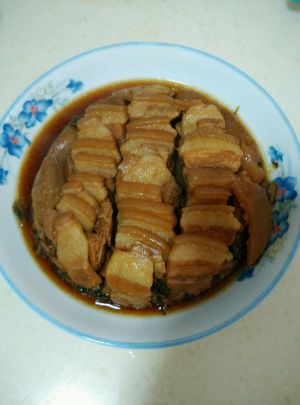 1.肉皮向下,放入碗出码紧实。 2.上面盖上炒好的梅干菜。 3.开水上锅蒸90-100分钟。