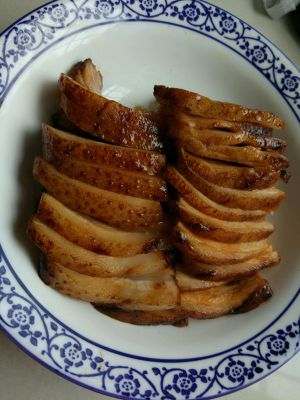 稍微凉凉切成2厘米厚的薄片,摆在盘中,上面在撒一点料酒和味达美酱油(味极鲜酱油也可以)