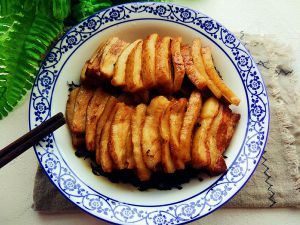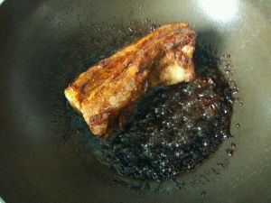 炸好的肉捞出放入冰水中,这样就会形成虎皮