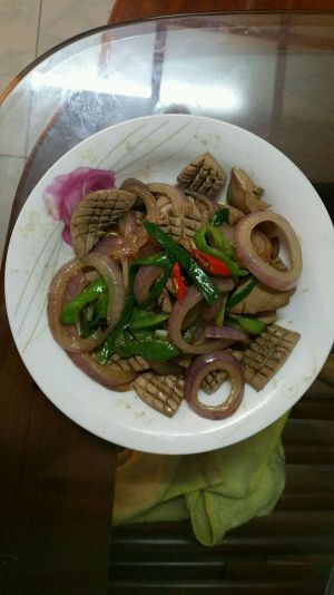 起锅烧油大火将腰花翻炒、炒好倒入辣椒、放鸡精,盐。