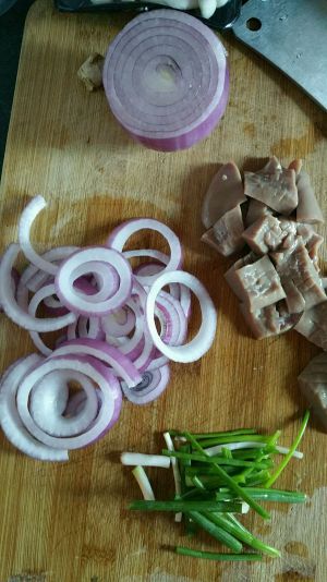 泡猪腰时可以把配料预备好:红萝卜切片、姜切末、蒜切末、葱头和葱尾切好分开.