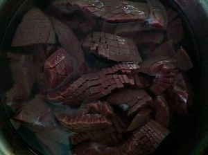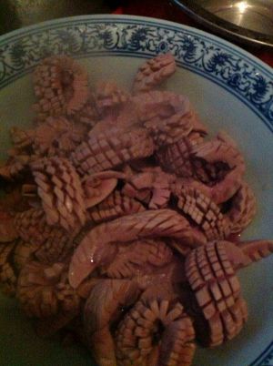 猪腰洗净切去里面白色组织,然后切花刀焯水后装盆子里用凉水泡一至二个小时。(中间水如果变得浑浊可以换下水.)其目的是为了去腥!