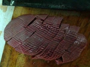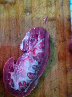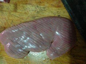 用快一点的刀把腰花切成两半、把白色的精去掉