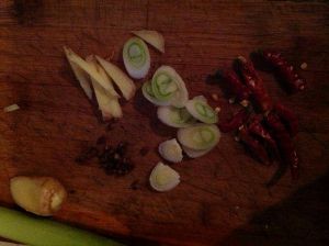 青红椒切成块状,葱白切成段,生姜切小片,干辣椒切段备用!