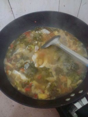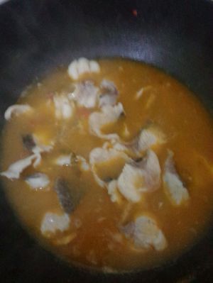 做汤底,(要求浓白,醇香。成菜的关键。)汤底烧要大火 ,家庭厨房火力比不上饭店,应该先烧红锅,加油再到出油,然后加入色拉油少量的菜油,油量大概 3两,烧到油冒烟,先放头尾骨。如果太多可以少放些,大概是油3倍。接下来翻炒,抄到鱼肉碎,注意不能有粘锅底和焦糊味,但是锅底必须要有点点的微焦,那种不影响颜色的焦。这是醇香的关键。然后加沸腾的水,慢慢加。要让水不停沸腾。水量大概是鱼骨的3倍。 这时你立马看到汤变成乳白色,大火五分钟,鱼汤很浓很白,但是闻着带土腥,这时加入花椒麻椒,生姜 大蒜,加料酒(注意加料时不要过猛,导致水不沸腾,料酒要少,多了影响颜色。)汤继续煮5分钟,这时的汤浓白,有点点粘稠,鱼香扑鼻,没了土腥味。然后加一点点 盐,味精,胡椒粉 。关火,过滤鱼骨和配料,汤底就完成。