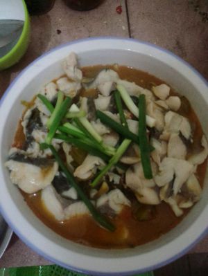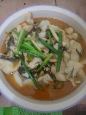 把葱段摆在鱼上面,把锅里热的油淋在容器里,好了,好吃爽口的酸菜鱼做好了
