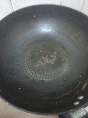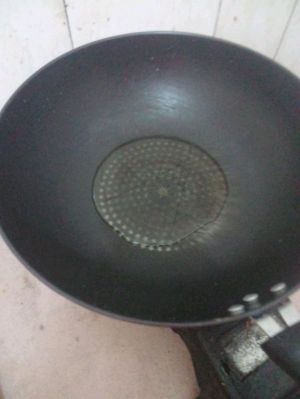 烧热油淋入 注意油量大概是3-4两油。油勺子和油一起加热,以免淋油,油温速降,油温大概到200度+。油温辨别,油表面平静,冒大量青烟即可。慢慢淋在葱花上,最后加入少量的太太乐麻油,提香和去除高温冲辣椒和葱的油腻味。