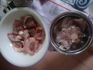 把鱼头鱼骨放在碗里用料酒盐生粉腌制一下,鱼肉用另外一个碗腌制