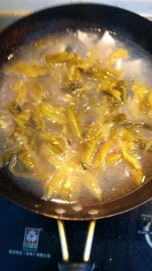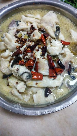 热锅放油,放入鱼头、鱼刺、酸菜炒,再加入开水烧二十分钟左右。放盐,尝尝味道,再把鱼头、鱼刺捞出放入大盆!剩下汤。把剩下的汤再烧开,放入腌制好的鱼片,鱼片一发白就关火。汤和鱼片一起倒入刚刚鱼头和酸菜的大盆中。