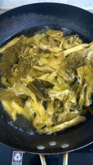 倒入适量底油加热,把刚刚切好的酸菜等放入锅内煸炒