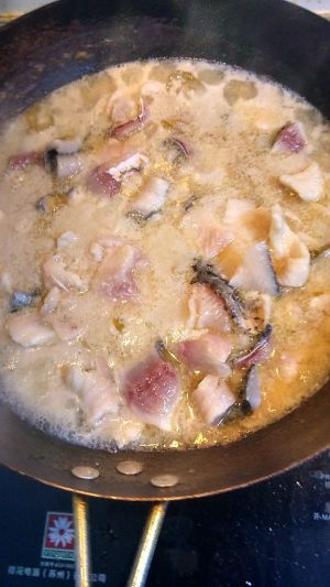 然后放入腌制入味的鱼片,煮到鱼片发白。