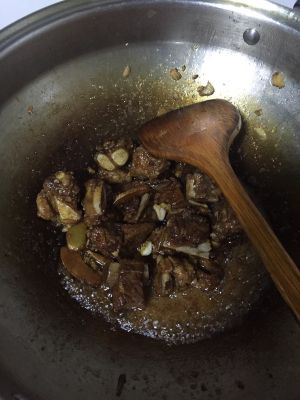 油烧热放入蒜姜,爆香后倒入排骨,再加入糖浆及陈醋大火翻炒,收汁即可出锅。