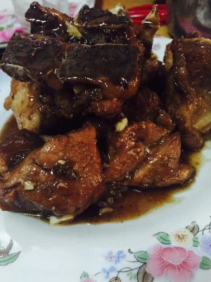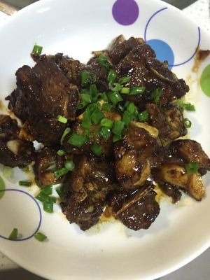 排骨熟后大火收汁。。其实全程大火就可以,先加盖住十五分钟,然后就不加盖煮,耗干水分,收汁,收汁以后你就会发现,颜色很好看,完全不需要加老抽,可以加点蒜末,蒜香风味。。。最后这张图是我的排骨,我喜欢这种肉多的腔骨,毕竟是为了吃肉,精排肉太少