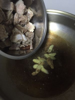 水中放入姜片,胡椒粉,料酒,精盐,再把排骨放入煮15分钟。