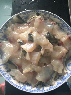 我用的罗非鱼,因为刺少,我们附近不好买到黑鱼,其实黑鱼是最好的!我每次片鱼片的时候那个鱼一直动特别吓人,这次我就把鱼冻了半天,办冻结实不结实的状态,没办法实在是太吓人了!把鱼切成片,最好是薄一点,那样不容易烂,原谅我的刀工。切完以后放入盐,黄酒,胡椒粉,淀粉(最后放淀粉啊)腌制40分钟以上。盐的话比平常炒菜少一点,因为酸菜有咸味!