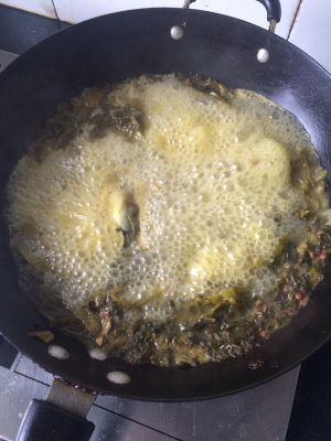 倒入开水,放盐、味精和白醋调味,辣椒酱是咸所以不用放太多盐;放鱼骨煮几分钟就得一锅金灿灿的汤啦 把酸菜鱼骨捞出放碗里,汤保持沸腾状态